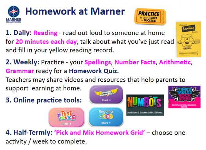 Homework at Marner is either time to practise new learning or activities to choose from that support and enrich learning. Practise time: as daily and weekly homework tasks to reinforce learning. There is a half-termly curriculum ‘pick and mix’ homework grid for each year group. Children choose an activity / week and homework projects are shared and celebrated in school.