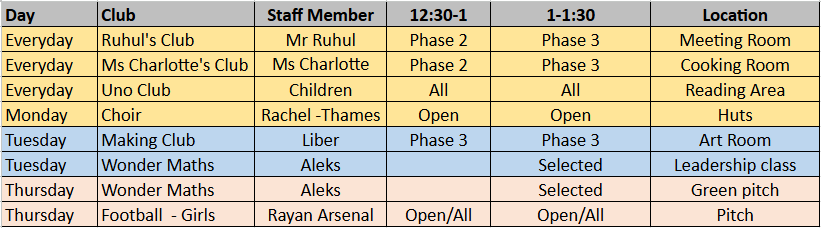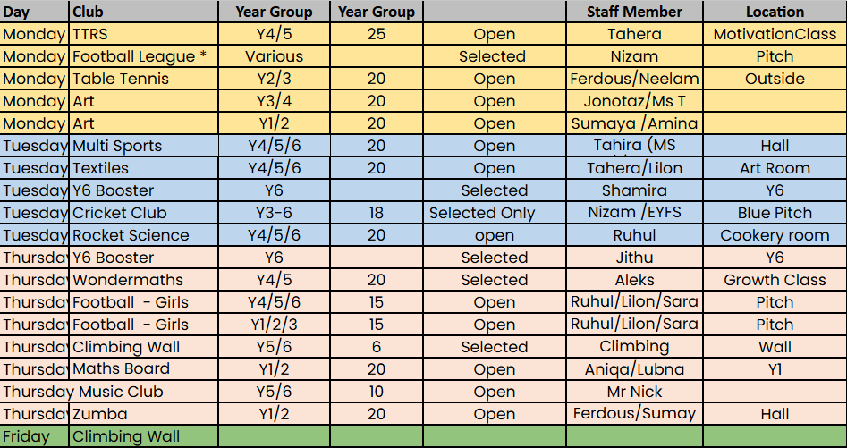 Each term we offer a variety of After School clubs. For some of these clubs, children are selected, for others, children can choose and sign up. We endeavour to have a range of clubs across the year groups and ensure all children have a chance to take part if they wish to.