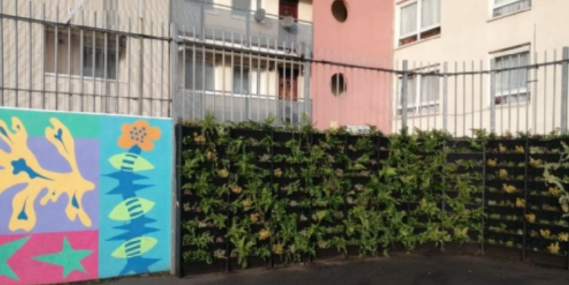 A plant box 'Living Wall' has been installed in the blue pitch. The benefits of a living wall are that they provide significant environmental and health benefits by improving air quality, increasing urban biodiversity, and offering natural insulation.