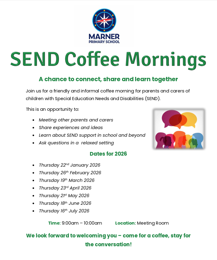 - Coffee mornings each week often feature a guest speaker or just to chat and meet other parents.